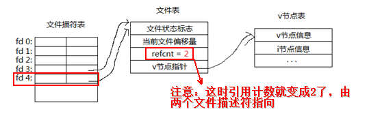 其中复制文件描述符,可以执行dup命令,注意,这时它会从0开始找出有空闲的文件描述符,如图,0、1、2是已经默认被系统给占用了,这时,执行dup之后,就会找到空闲的fd 4文件描述符,将它也指向同一个文件表,如图: