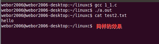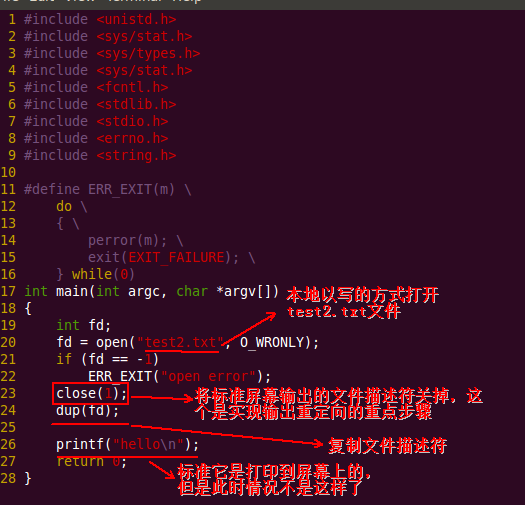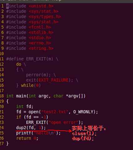 对于dup2,理解它,我们可以将上面复制文件描述符的程序用dup2代替dup,如下: