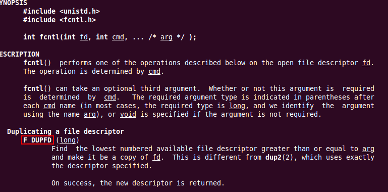 另外第三种复制文件描述符的方法,是通过fcntl函数,它稍复杂一些,这个会在下节详细进行分析,先看一下man帮助: