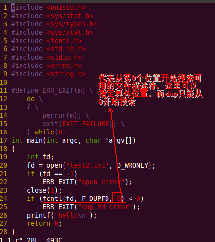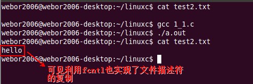 我们将上节当中用dup或dup2实现复制文件描述符改用fcntl,程序如下: