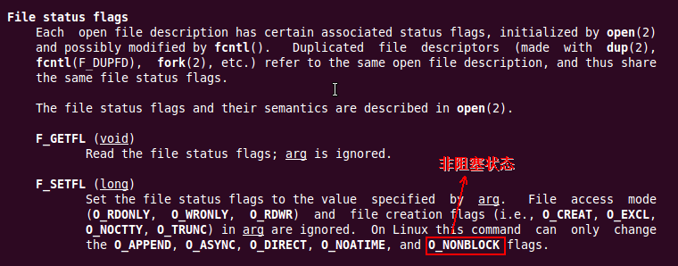 【注意:在设置状态时,一定得先用F_GETFL获取状态,然后再去用F_SETFL去设置,因为我们只想设置非阻塞的状态,对于其它状态如:写状态,读状态等想保留】