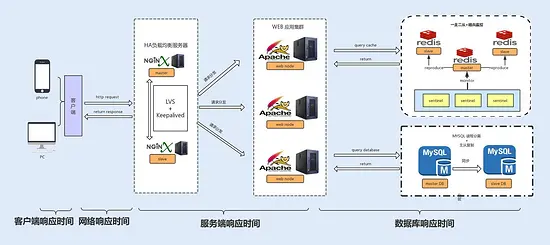 响应时间是衡量系统性能的重要指标之一,响应时间越短,性能越好,一般一个接口的响应时间是在毫秒级。在系统中,我们可以把响应时间自下而上细分为以下几种: