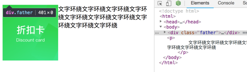 可以看到,父元素的高度为0,但这不是bug,而是float本身就是这样设计的,因此只有让父元素高度塌陷了,后面的元素才有机会浮上来。但是仅仅是这样还是不可以形成图片环绕效果的,不然文字浮上来就只会覆盖在图片上面。这里面还隐藏着一个特性: 行框盒子和浮动元素的不可重叠性 意思是说行框盒子和浮动元素不会发生重叠,因此,下面的文字浮上去之后才不会覆盖在图片之上。即使我们给文字设置margin负值也不会起作用。没有margin合并 设置了float的元素,由于形成了BFC,因此也就没有了margin合并。