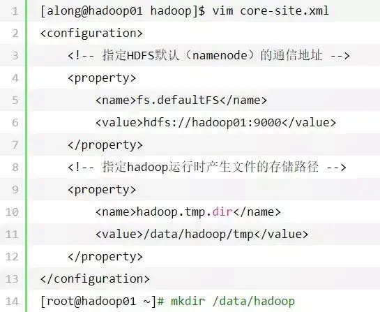 [along@hadoop01 hadoop]$ vim hdfs-site.xml<!-- 设置namenode的http通讯地址 -->dfs.namenode.http-addresshadoop01:50070 <!-- 设置secondarynamenode的http通讯地址 -->dfs.namenode.secondary.http-addresshadoop02:50090 <!-- 设置namenode存放的路径 -->dfs.namenode.name.dir/data/hadoop/name <!-- 设置hdfs副本数量 -->dfs.replication2<!-- 设置datanode存放的路径 -->dfs.datanode.data.dir/data/hadoop/datanode dfs.permissionsfalse[root@hadoop01 ~]# mkdir /data/hadoop/name -p[root@hadoop01 ~]# mkdir /data/hadoop/datanode -p