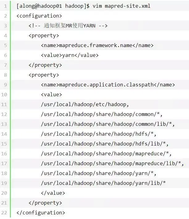 [along@hadoop01 hadoop]$ vim yarn-site.xmlyarn.resourcemanager.hostnamehadoop01 The http address of the RM web application.yarn.resourcemanager.webapp.address${yarn.resourcemanager.hostname}:8088 The address of the applications manager interface in the RM.yarn.resourcemanager.address${yarn.resourcemanager.hostname}:8032 The address of the scheduler interface.yarn.resourcemanager.scheduler.address${yarn.resourcemanager.hostname}:8030 yarn.resourcemanager.resource-tracker.address${yarn.resourcemanager.hostname}:8031 The address of the RM admin interface.yarn.resourcemanager.admin.address${yarn.resourcemanager.hostname}:8033