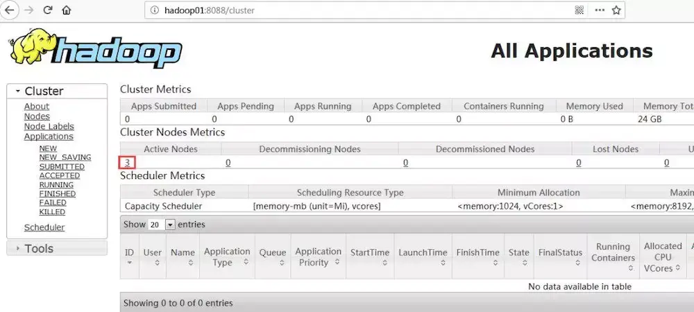 该页面为 ResourceManager 管理界面,在上面可以看到集群中的三台 Active Nodes。