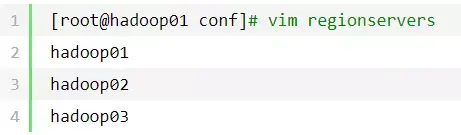 [root@hadoop01 conf]# vim hbase-site.xmlhbase.rootdir<!-- hbase存放数据目录 -->hdfs://hadoop01:9000/hbase/hbase_db<!-- 端口要和Hadoop的fs.defaultFS端口一致-->hbase.cluster.distributed<!-- 是否分布式部署 -->truehbase.zookeeper.quorum<!-- zookooper 服务启动的节点,只能为奇数个 -->hadoop01,hadoop02,hadoop03<!--zookooper配置、日志等的存储位置,必须为以存在 -->hbase.zookeeper.property.dataDir/data/hbase/zookeeper<!--hbase master -->hbase.masterhadoop01<!--hbase web 端口 -->hbase.master.info.port16666