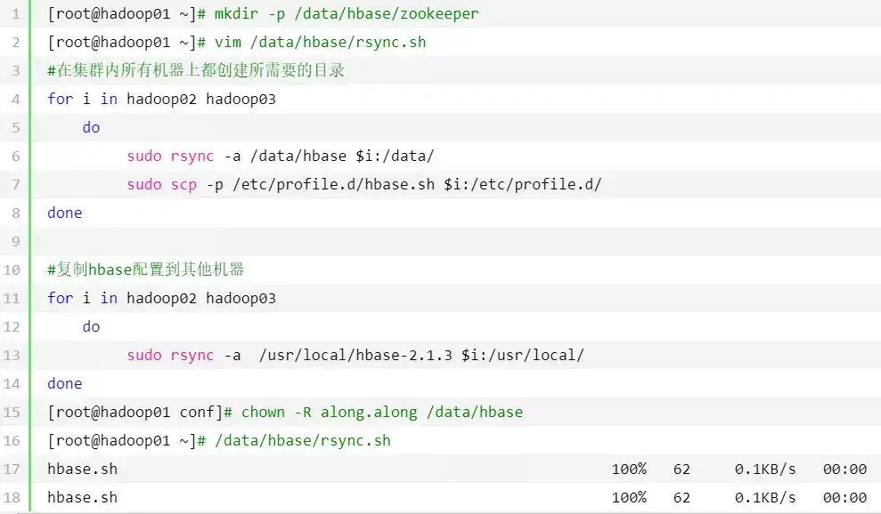 [root@hadoop01 ~]# wget https://mirrors.tuna.tsinghua.edu.cn/apache/hbase/1.4.9/hbase-1.4.9-bin.tar.gz[root@hadoop01 ~]# tar -xvf hbase-1.4.9-bin.tar.gz -C /usr/local/[root@hadoop01 ~]# chown -R along.along /usr/local/hbase-1.4.9/[root@hadoop01 ~]# ln -s /usr/local/hbase-1.4.9/ /usr/local/hbase