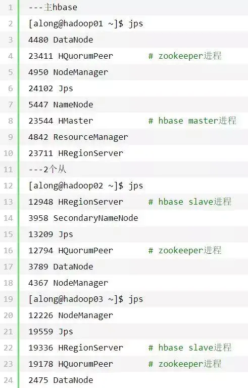 [along@hadoop01 ~]$ hbase shell#需要等待一些时间SLF4J:Class path contains multiple SLF4J bindings.SLF4J:Found bindingin[jar:file:/usr/local/hbase-1.4.9/lib/slf4j-log4j12-1.7.10.jar!/org/slf4j/impl/StaticLoggerBinder.class]SLF4J:Found bindingin[jar:file:/usr/local/hadoop-3.2.0/share/hadoop/common/lib/slf4j-log4j12-1.7.25.jar!/org/slf4j/impl/StaticLoggerBinder.class]SLF4J:Seehttp://www.slf4j.org/codes.html#multiple_bindings for an explanation.SLF4J:Actual binding is of type [org.slf4j.impl.Log4jLoggerFactory]HBase ShellUse"help"to get list of supported commands.Use"exit"to quit this interactive shell.Version1.4.9, rd625b212e46d01cb17db9ac2e9e927fdb201afa1, Wed Dec511:54:10PST2018 hbase(main):001:0>