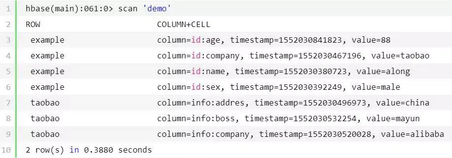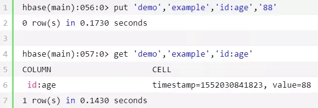 hbase(main):024:0>create'demo','id','info'0row(s)in10.0720seconds => Hbase::Table - demohbase(main):025:0>is_enabled'demo'true0row(s)in0.1930seconds hbase(main):030:0>put'demo','example','id:name','along'0row(s)in0.0180seconds hbase(main):039:0>put'demo','example','id:sex','male'0row(s)in0.0860seconds hbase(main):040:0>put'demo','example','id:age','24'0row(s)in0.0120seconds hbase(main):041:0>put'demo','example','id:company','taobao'0row(s)in0.3840seconds hbase(main):042:0>put'demo','taobao','info:addres','china'0row(s)in0.1910seconds hbase(main):043:0>put'demo','taobao','info:company','alibaba'0row(s)in0.0300seconds hbase(main):044:0>put'demo','taobao','info:boss','mayun'0row(s)in0.1260seconds