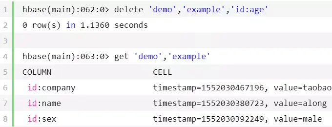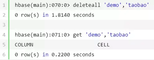 hbase(main):045:0>get'demo','example'COLUMN CELL id:age timestamp=1552030411620, value=24id:company timestamp=1552030467196, value=taobaoid:name timestamp=1552030380723, value=alongid:sex timestamp=1552030392249, value=male1row(s)in0.8850seconds hbase(main):046:0>get'demo','taobao'COLUMN CELL info:addres timestamp=1552030496973, value=chinainfo:boss timestamp=1552030532254, value=mayuninfo:company timestamp=1552030520028, value=alibaba1row(s)in0.2500seconds hbase(main):047:0>get'demo','example','id'COLUMN CELL id:age timestamp=1552030411620, value=24id:company timestamp=1552030467196, value=taobaoid:name timestamp=1552030380723, value=alongid:sex timestamp=1552030392249, value=male1row(s)in0.3150seconds hbase(main):048:0>get'demo','example','info'COLUMN CELL 0row(s)in0.0200seconds hbase(main):049:0>get'demo','taobao','id'COLUMN CELL 0row(s)in0.0410seconds hbase(main):053:0>get'demo','taobao','info'COLUMN CELL info:addres timestamp=1552030496973, value=chinainfo:boss timestamp=1552030532254, value=mayuninfo:company timestamp=1552030520028, value=alibaba1row(s)in0.0240seconds hbase(main):055:0>get'demo','taobao','info:boss'COLUMN CELL info:boss timestamp=1552030532254, value=mayun1row(s)in0.1810seconds