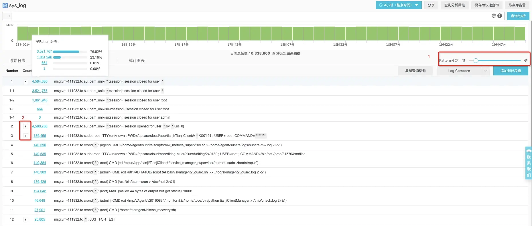 通过调整下面截图中红色框1的大小,可以改变图中红色框2的结果,但是对于每个最细粒度的pattern并不会改变,也就是说:子Pattern的结果是稳定且唯一的,我们可以通过子Pattern的Signature找到对应的原始日志条目。