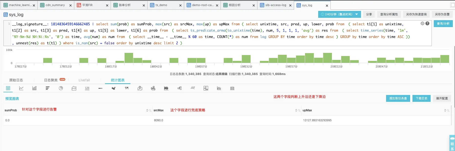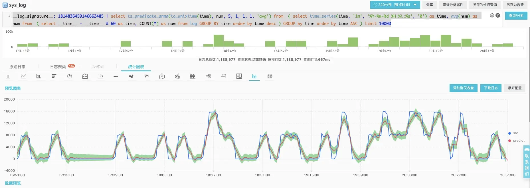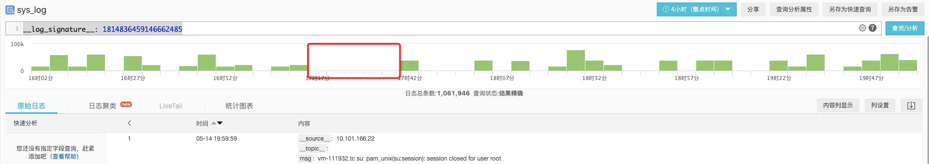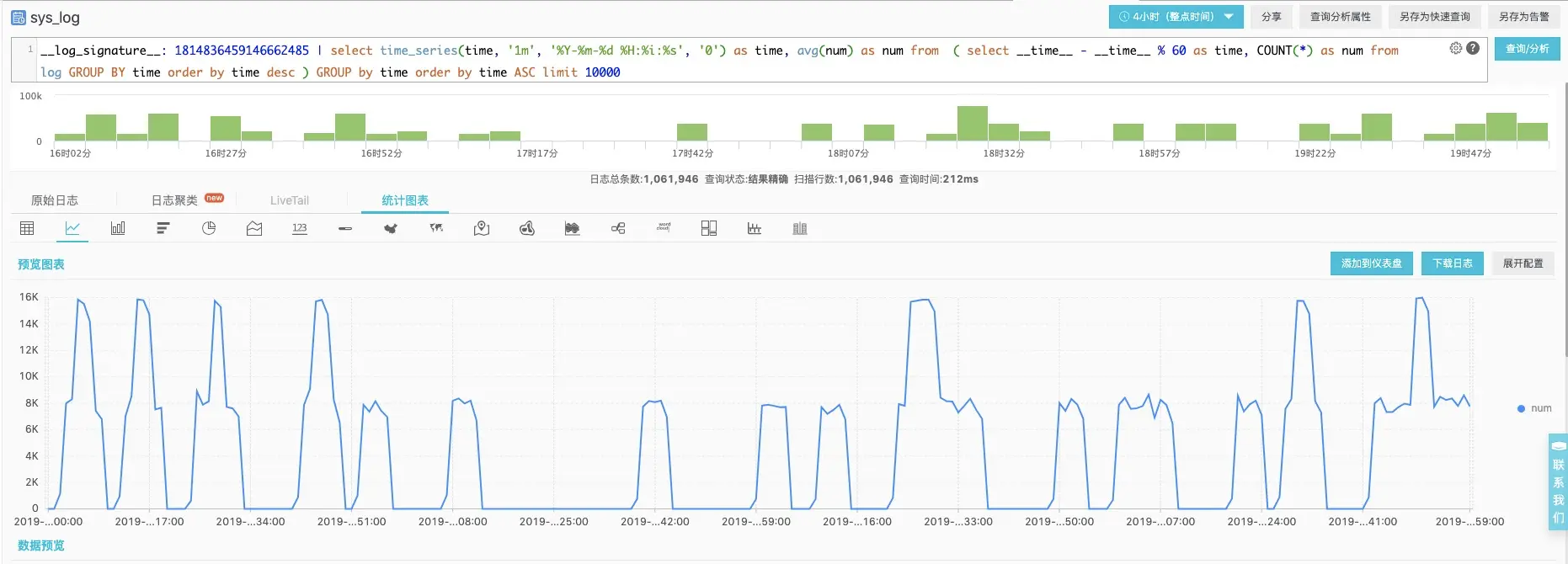 我们得到了上述pattern对应的原始日志,可以看下具体的数量在时间轴上的直返图: