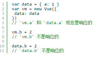 扩展:尽管 Vue.js 提供了 API 动态地添加响应属性,还是推荐在 data 对象上声明所有的响应属性。 这么做有两个原因: 1.data 对象就像组件状态的模式(schema)。在它上面声明所有的属性让组件代码更易于理解。