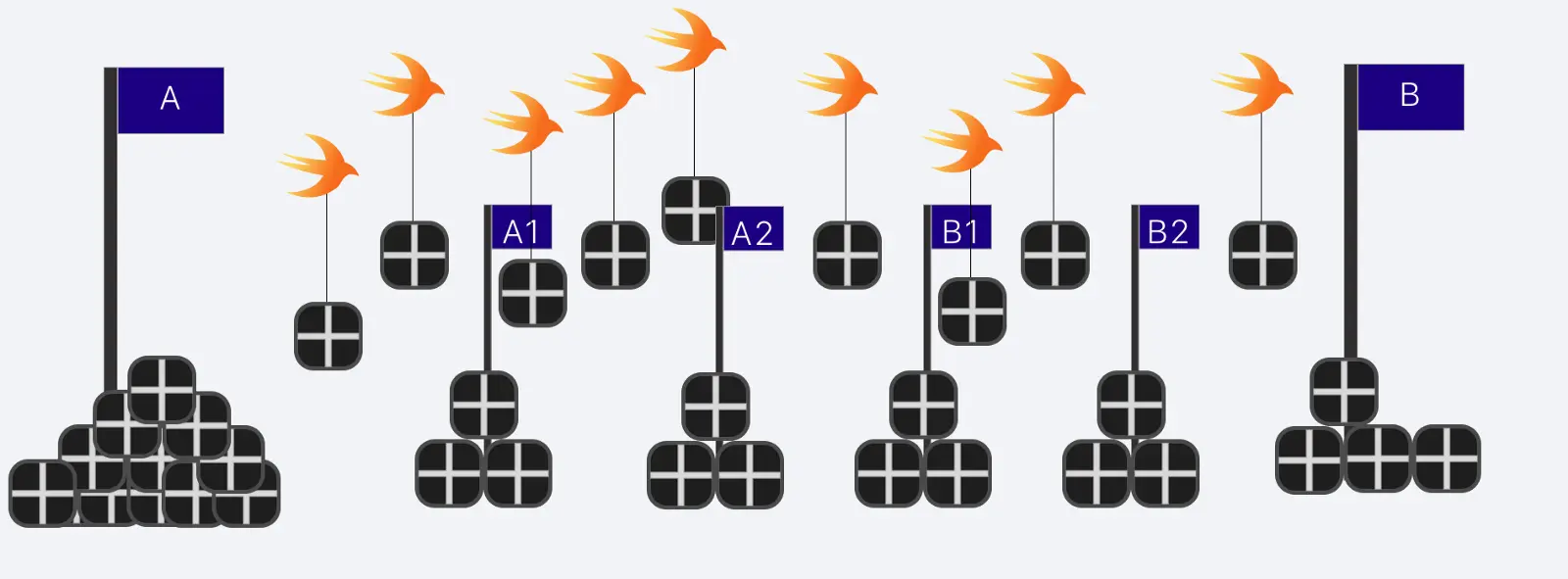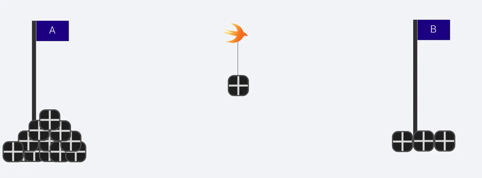 如果我们只有一个工人,我们想让他多做几件事,那么发生什么呢?那么我们就应该考虑在处理状态下有多个盒子了。这就是并发的含义,它就好比把从 A 点到 B 点的距离分割为几步,工人可以从 A 点拿一个盒子,走到一半放下盒子,再回到 A 点去拿另一个盒子。