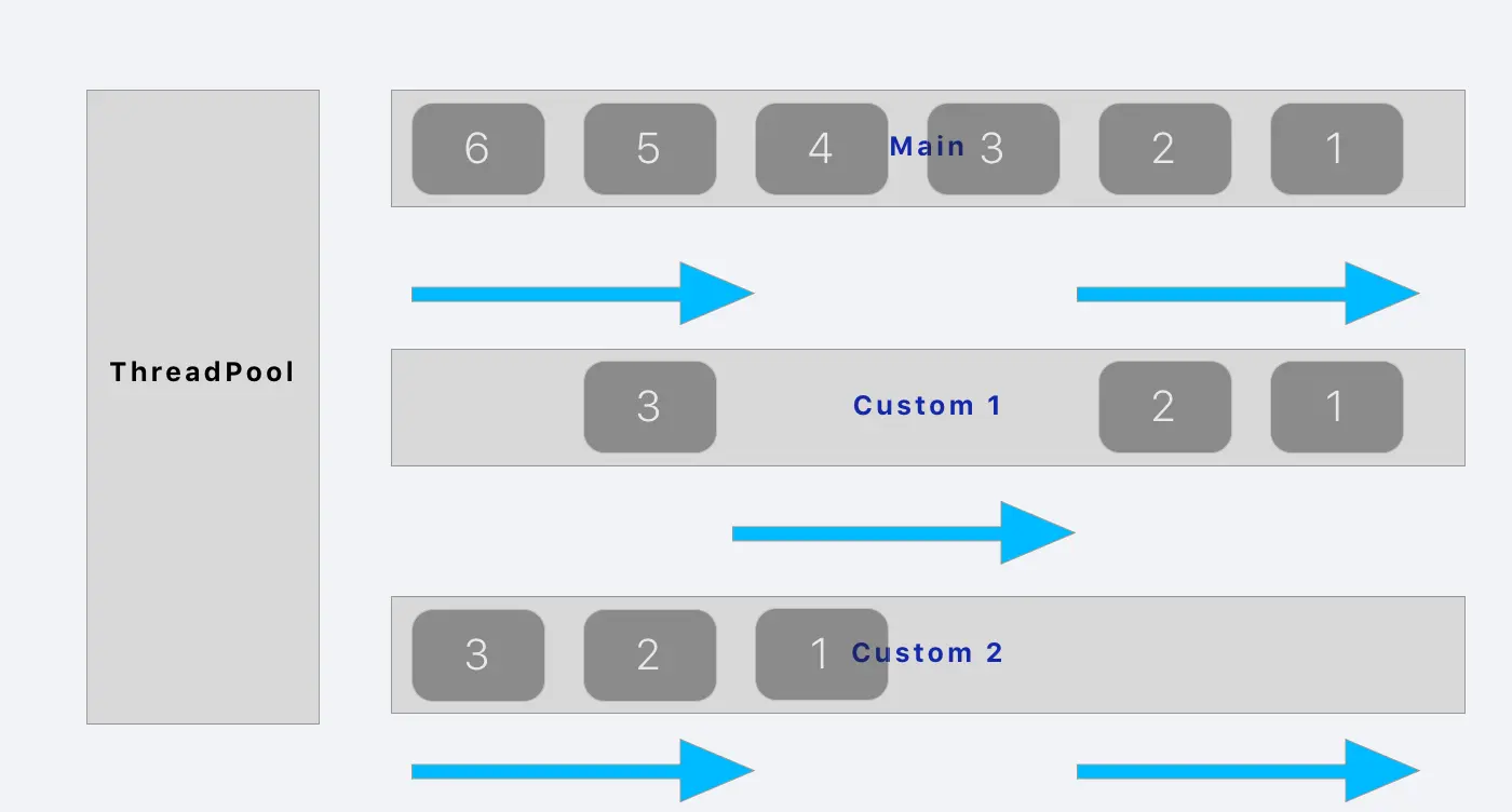 - SerialQueue:串行队列,它会顺序执行该队列的任务。