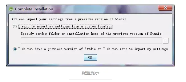 刚开始打开的时候会问我们是否加载本地的配置信息,其实就是android studio的配置环境信息等,如果你以前没有用过,忽略掉就好了。直接按默认的点ok启动android studio