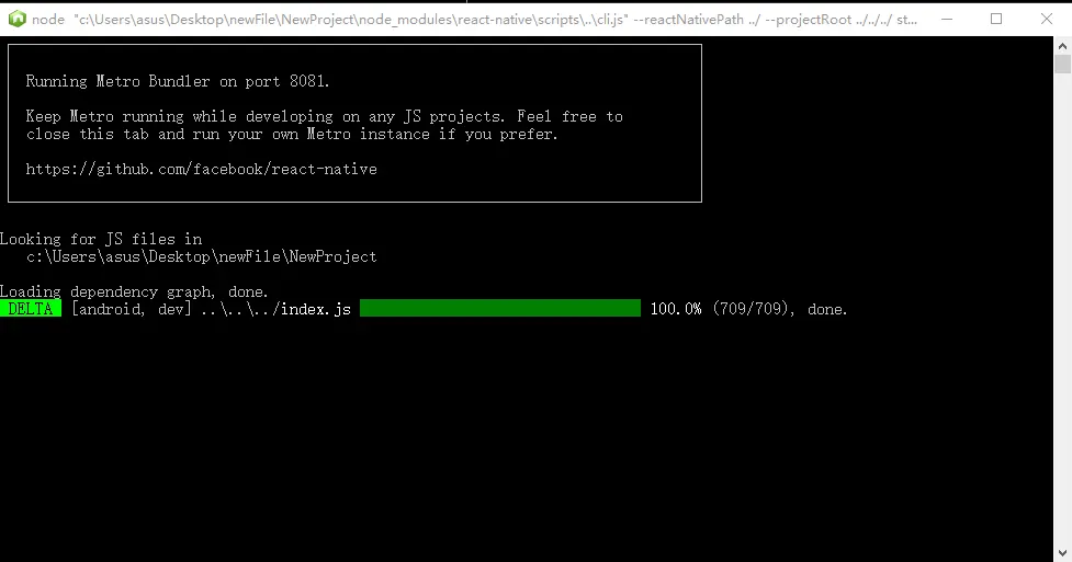 react-native run-android输入命令后,项目开始初始化运行,运行过程中会打开一个 node 服务窗口,如下所示:
