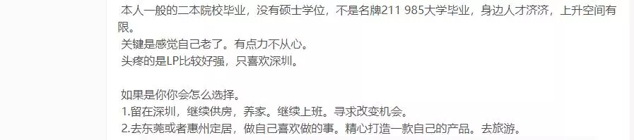 而且随着年龄渐长,他做程序员也越来越力不从心,上升空间也有限,因此萌生了想退居二线城市的念头。问题是妻子是个好强的人,并且只喜欢深圳。
