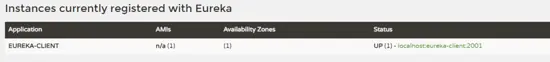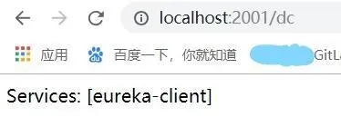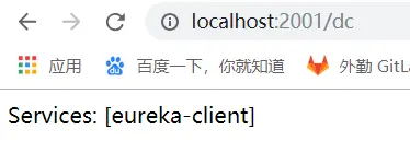 eureka-client 服务提供的 /dc 接口来获取当前的服务清单,只需要访问: http://localhost:2001/dc,可以得到一下输出:其中,方括号中的 eureka-client 就是通过Spring Cloud定义的 DiscoveryClient 接口在eureka的实现中获取到的所有服务清单。