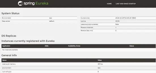 复制代码为了与后续要进行注册的服务区分,这里将服务注册中心的端口通过server.port属性设置为1001。启动工程后,访问: http://localhost:1001/ ,可以看到下面的页面,其中还没有发现任何服务。