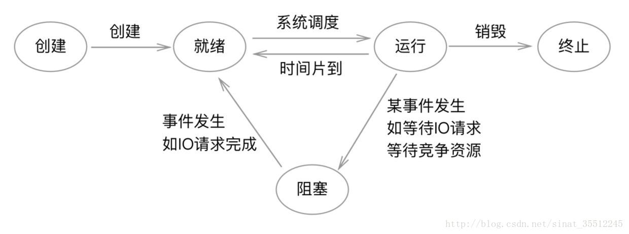 一个线程/进程经历的5个状态,创建,就绪,运行,阻塞,终止。各个状态的转换条件如上图,其中有个阻塞状态,就是说当线程中调用某个函数,需要IO请求,或者暂时得不到竞争资源的,操作系统会把该线程阻塞起来,避免浪费CPU资源,等到得到了资源,再变成就绪状态,等待CPU调度运行。