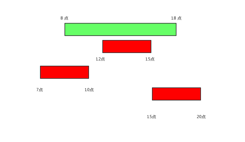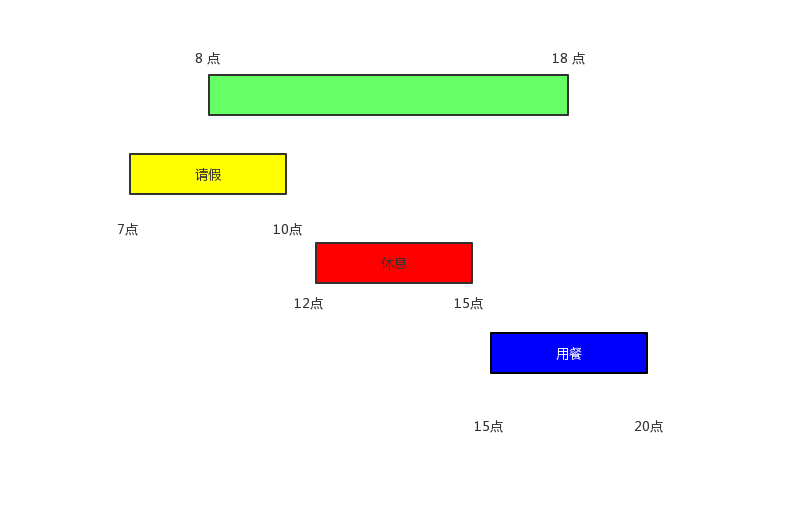 根据 getExceptTimePeriodInSchedule 方法,我们已经获取到所有在排班区间内的排班数据。这个时候,我们就需要处理请假、休息、用餐交叉问题。看见三个数组,想想都有点发慌,首先脑海中瞬间决定不能通过遍历每一个数组来解决交叉问题。我们先画个图再仔细思考。