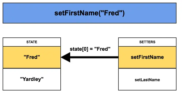 每一个 setter 函数,都关联了对应的指针位置。当调用某个 setter 函数式,就可以通过这个函数所关联的指针,找到对应的 state,修改state数组里对应位置的值: