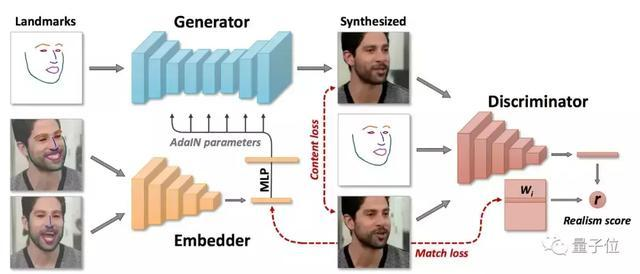 生成器网络通过卷积层集将面部特征输入映射到输出帧中,之后,通过嵌入器传递来自同一视频的帧集,平均得到的嵌入并使用它们来预测生成器的自适应参数。