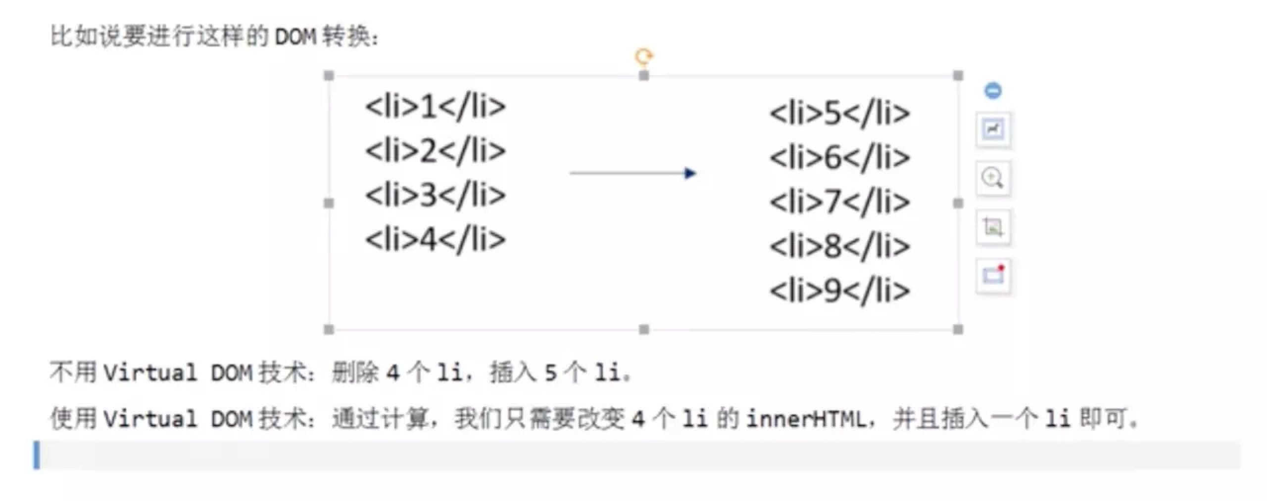标签调用onChange函数函数中会匿名传两个参数 <select onChange={this.handleOnChange}> <Option value="值">显示名称</Option> </select> handleOnChange = (value, option = null) => { value \\下拉框的值 option.props.children \\显示名称 }; 1.数组定义 let cc = ['姓名', '年龄', 2, {'性别':'男'}] // 数组 var a = [1, 2, 3]; for (var i in a) { console.log(a[i]); } 数组的使用,放在react代码中,可以自动展开 class News extends React.Component{ constructor(props){ super(props) this.state={ msg:'新闻', list:['1111','2222','3333'] } } render(){ let listResult=this.state.list.map(function(value,key){ return ({value}) }) return( {listResult} ) } } 父子组件传值 <br> 子组件获取值 {this.props.a} {this.props.b} 在子组件中props是只读的,不能修改。 -------------------------------------------------------------------------- React可以搭配Flux等架构(Redux实现)使用。<br> 有Flux架构护航,数据的单向流动,自称是比MVC,MVVM更高一级的模式。<br> React 使用jsx语法糖<br> 浏览器工作流<br> 创建DOM树<br> 一旦浏览器接收到一个HTML文件,渲染引擎(render engine)就开始解析它,并根据HTML元素(elements)一一对应地生成DOM 节点(nodes),组成一棵DOM树。<br> 创建渲染树<br> 同时,浏览器也会解析来自外部CSS文件和元素上的inline样式。通常浏览器会为这些样式信息,连同包含样式信息的DOM树上的节点,再创建另外一个树,一般被称作渲染树(render tree)<br> 创建渲染树背后的故事<br> WebKit内核的浏览器上,处理一个节点的样式的过程称为attachment。DOM树上的每个节点都有一个attach方法,它接收计算好的样式信息,返回一个render对象(又名renderer) Attachment的过程是同步的,新节点插入DOM树时,会调用新节点的attach方法。 构建渲染树时,由于包含了这些render对象,每个render对象都需要计算视觉属性(visual properties);这个过程通过计算每个元素的样式属性来完成。<br> 布局 Layout<br> 又被简称为Reflow[2] 构造了渲染树以后,浏览器引擎开始着手布局(layout)。布局时,渲染树上的每个节点根据其在屏幕上应该出现的精确位置,分配一组屏幕坐标值。<br> 绘制 Painting<br> 接着,浏览器将会通过遍历渲染树,调用每个节点的paint方法来绘制这些render对象。paint方法根据浏览器平台,使用不同的UI后端API(agnostic UI backend API)。 通过绘制,最终将在屏幕上展示内容。<br> Virtual DOM技术<br> DOM操作真正的问题在于每次操作都会触发布局的改变、DOM树的修改和渲染。所以,当你一个接一个地去修改30个节点的时候,就会引起30次(潜在的)布局重算,30次(潜在的)重绘,等等。 Virtual DOM 实际上没有使用什么全新的技术,仅仅是把 “ 双缓冲(double buffering)” 技术应用到了DOM上面。<br> 这样一来,当你在这个单独的虚拟的DOM树上也一个接一个地修改30个节点的时候,它不会每次都去触发重绘,所以修改节点的开销就变小了。<br> 之后,一旦你要把这些改动传递给真实DOM,之前所有的改动就会整合成一次DOM操作。这一次DOM操作引起的布局计算和重绘可能会更大,但是相比而言,整合起来的改动只做一次,减少了(多次)计算。 不过,实际上不借助Virtual DOM也可以做到这一点。你可以自己手动地整合所有的DOM操作到一个DOM 碎片(DOM fragment) 里,然后再传递给DOM树。<br> Virtual DOM到底解决了什么问题。<br> 首先,它把管理DOM碎片这件事情自动化、抽象化了,使得你无需再去手动处理。另外,当你要手动去做这件事情的时候,你还得记得哪些部分变化了,哪些部分没变,毕竟之后重绘时,DOM树上的大量细节你都不需要重新刷新。这时候Virtual<br> DOM的自动化对你来说就非常有用了,如果它的实现是正确的 ,那么它就会知道到底哪些地方应该需要刷新,哪些地方不要。<br> 最后,Virtual DOM通过各种组件和你写的一些代码来请求对它进行操作,而不是直接对它本身进行操作,使你不必非要跟Virtual DOM交互,也不必非要去了解Virtual<br> DOM修改DOM树的原理,也就不用 再想着去修改DOM了。对开发者来说,Virtual DOM几乎是完全透明的。这样你就不用在修改DOM 和 整合DOM操作为一次之间做同步处理了。<br>  Virtual DOM的核心就是计算。<br>