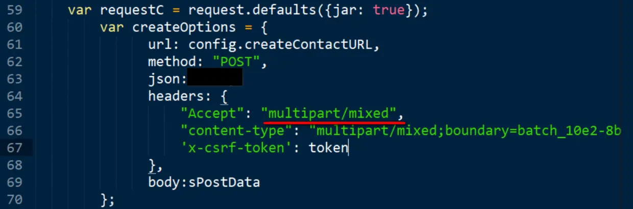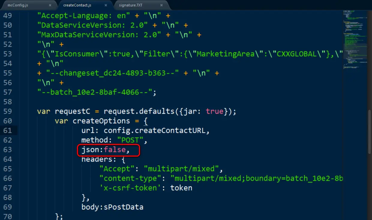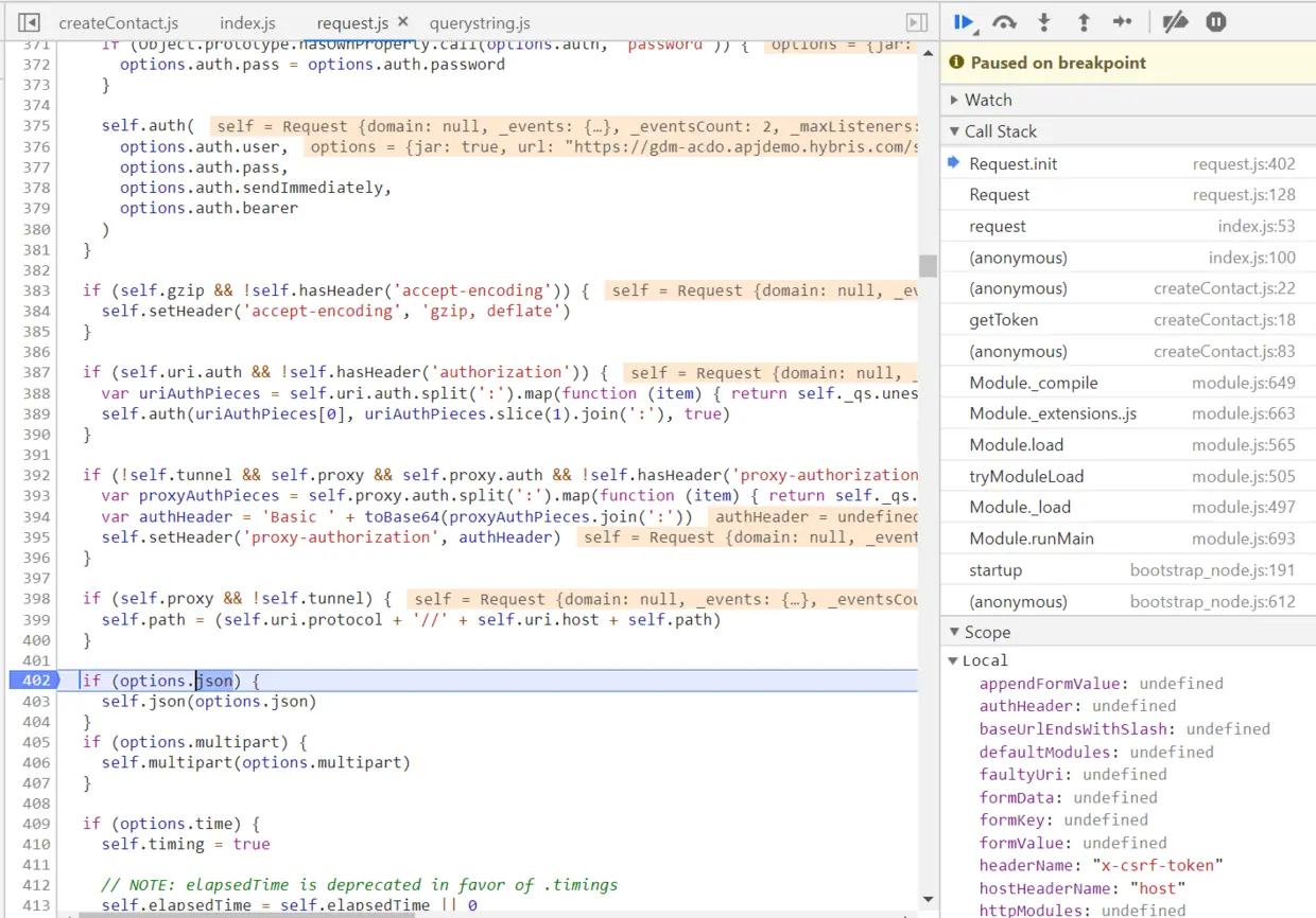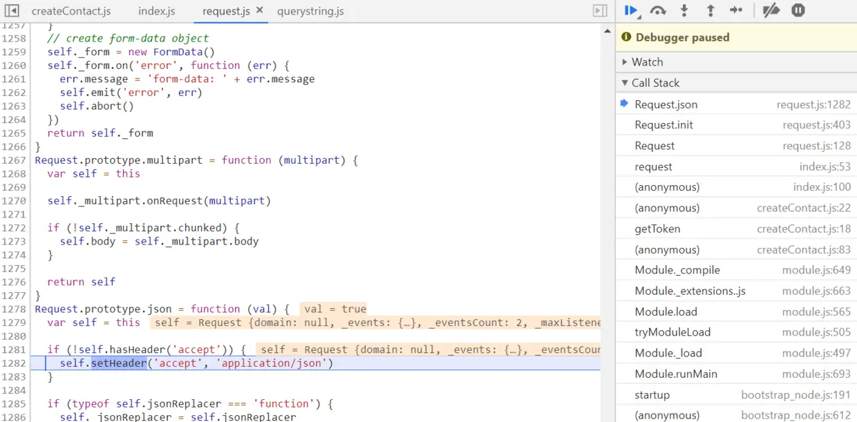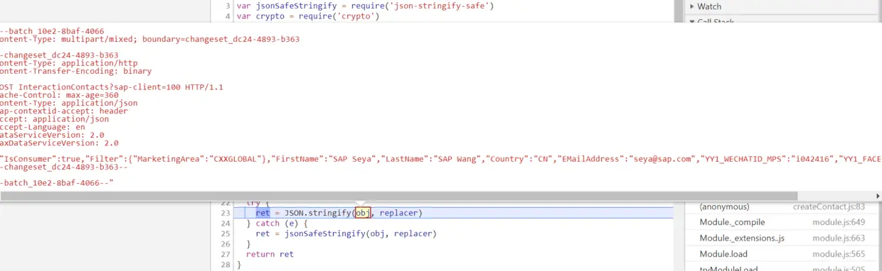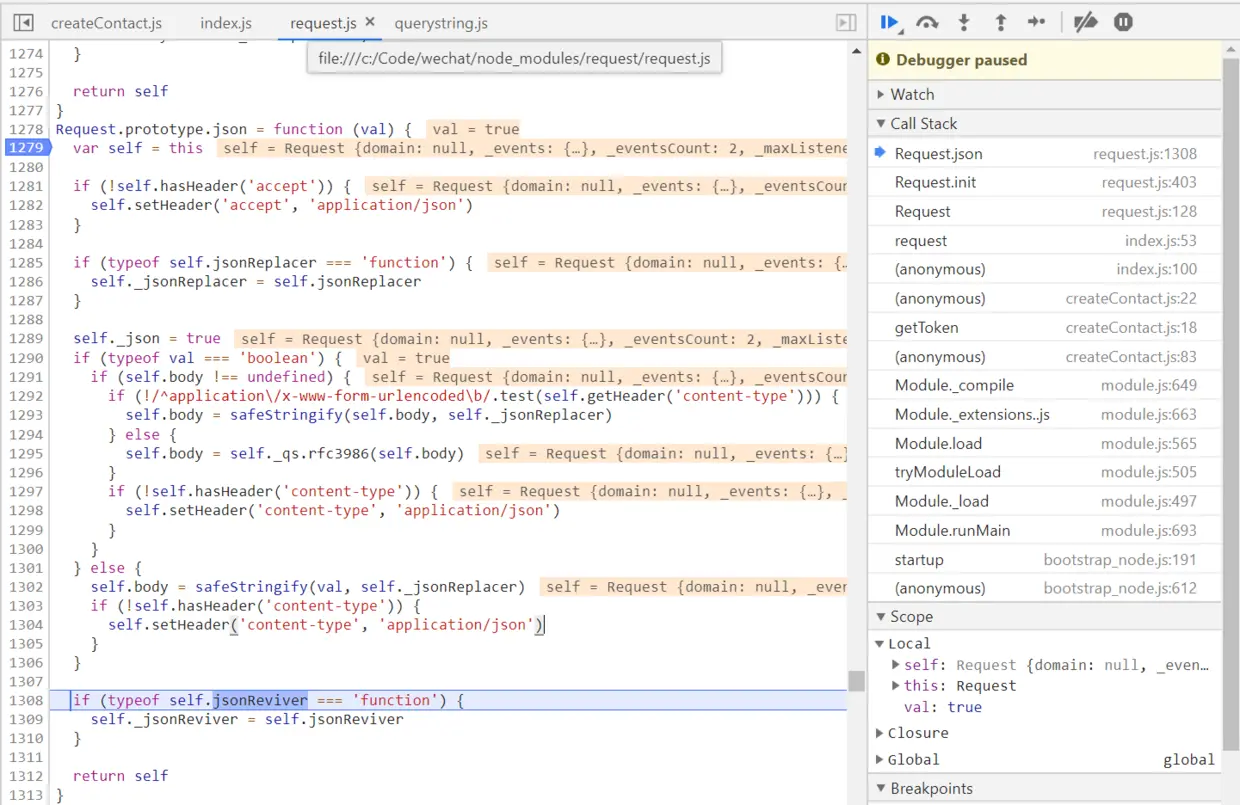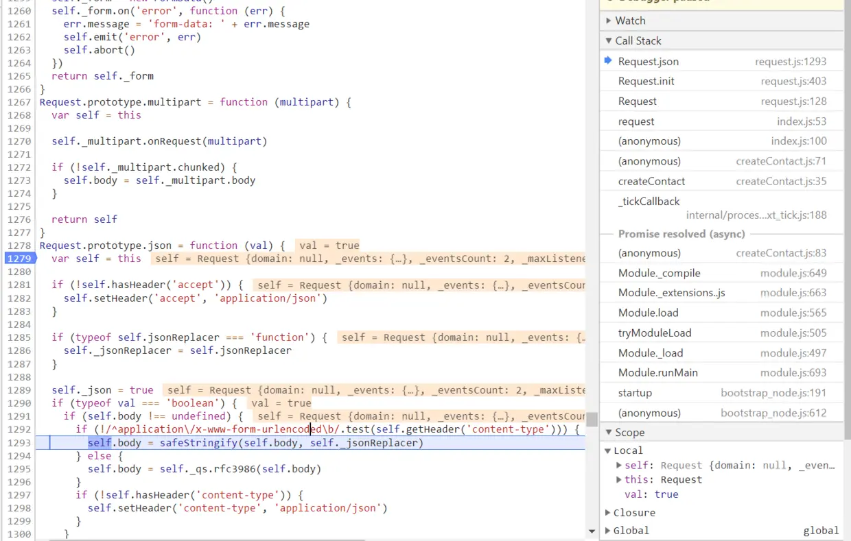 safeStringify的实现逻辑就是浏览器原生的JSON.stringify, 把应用程序传入的json对象序列化成字符串。但是我的代码里,传入request module的请求体是一个字符串,而json参数设的又是true,所以逻辑上就不对了。把这个json参数的值改为false后,一切正常。