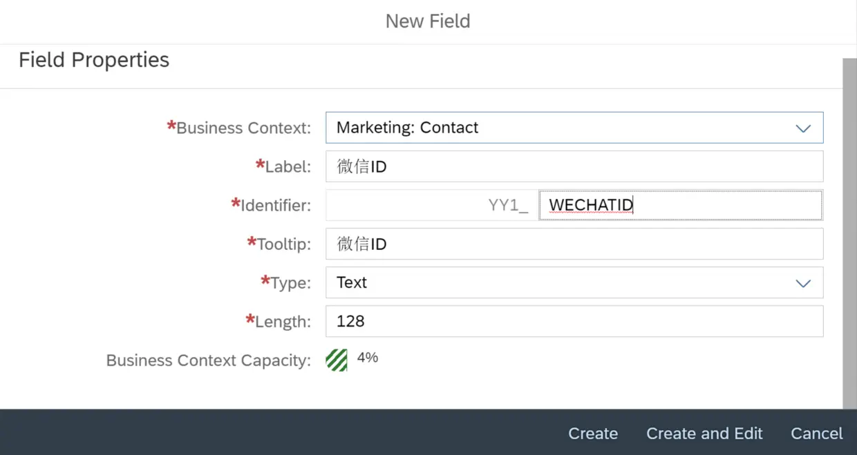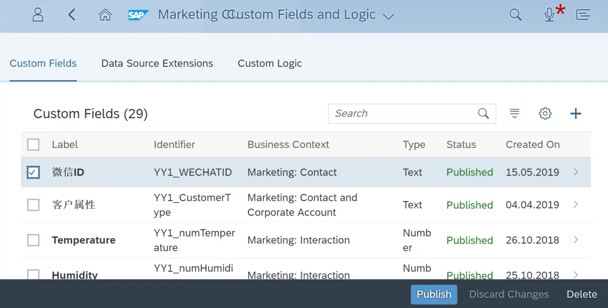 这会进入Fiori应用“Custom fields”,能看到系统里所有创建好的extension field。点击+加号按钮新建一个: