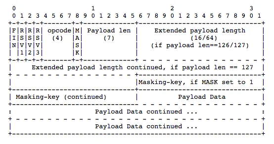 RSV1,RSV2,RSV3: 各占1bit, 一般情况下全为0, 与Websocket拓展有关, 如果出现非零的值且没有采用WebSocket拓展, 连接出错 -