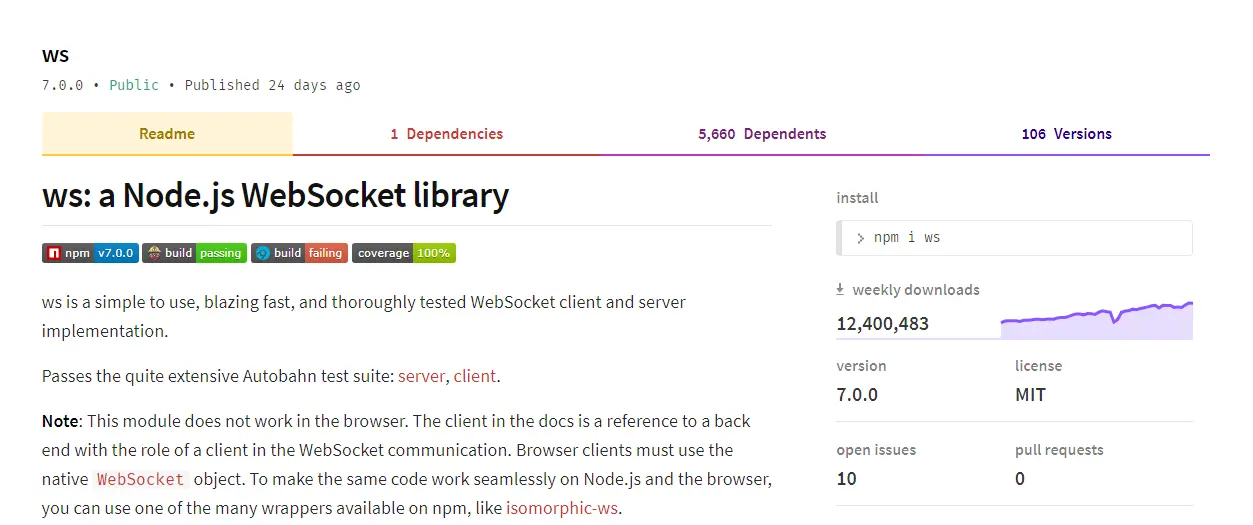 虽然之前用的都是socket.io, 偶然发现了ws, 使用量竟然还挺大, 周下载量是socket.io的六倍