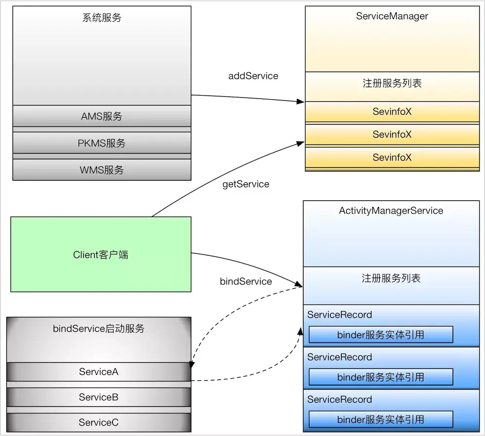 首先看一下服务的启动上,系统服务一般都是SystemServer进程负责启动,比如AMS,WMS,PKMS,电源管理等,这些服务本身其实实现了Binder接口,作为Binder实体注册到ServiceManager中,被ServiceManager管理,而SystemServer进程里面会启动一些Binder线程,主要用于监听Client的请求,并分发给响应的服务实体类,可以看出,这些系统服务是位于SystemServer进程中(有例外,比如Media服务)。在来看一下bindService类型的服务,这类服务一般是通过Activity的startService或者其他context的startService启动的,这里的Service组件只是个封装,主要的是里面Binder服务实体类,这个启动过程不是ServcieManager管理的,而是通过ActivityManagerService进行管理的,同Activity管理类似。