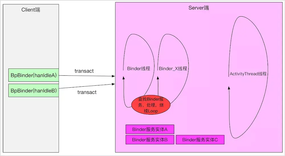 Binder线程是执行Binder服务的载体,只对于服务端才有意义,对请求端来说,是不需要考虑Binder线程的,但Android系统的处理机制其实大部分是互为C/S的。比如APP与AMS进行交互的时候,都互为对方的C与S,这里先不讨论这个问题,先看Binder线程的概念。