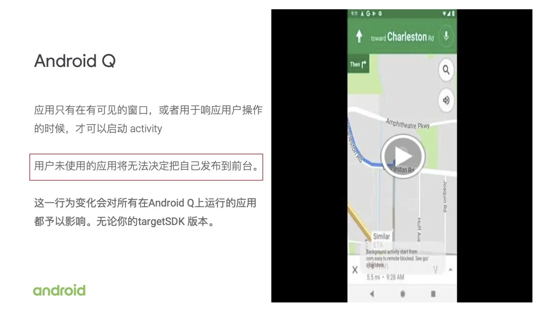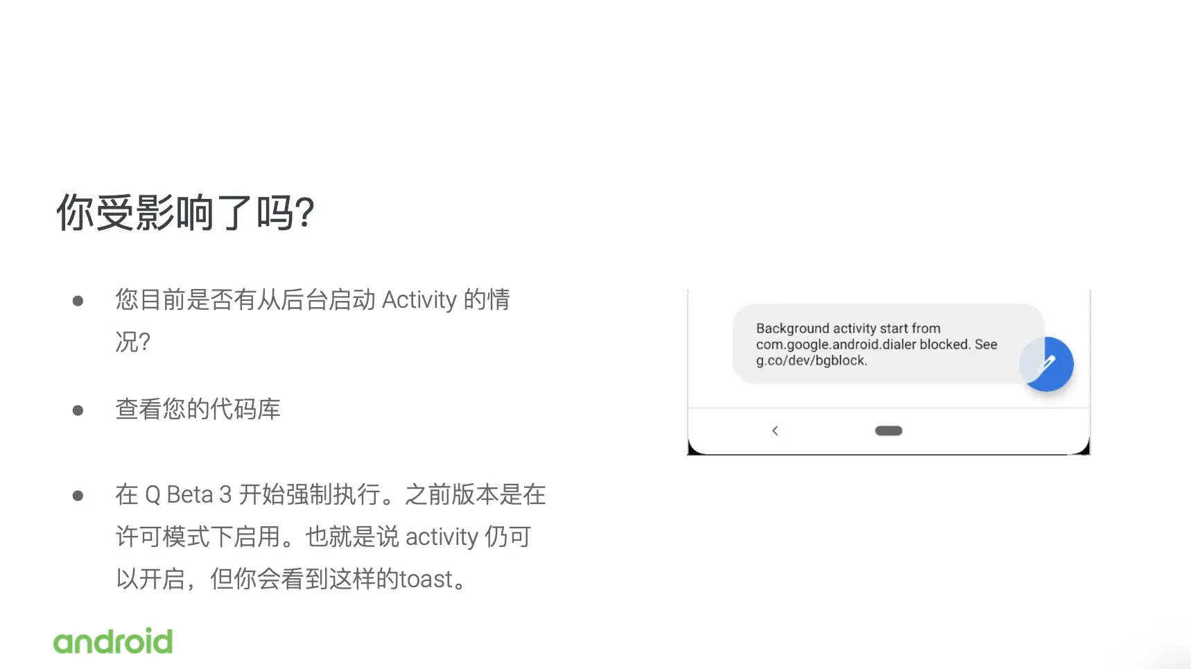 - 在 Q Beta 3开始强制执行,之前版本是在许可模式下启用,也就是说 activity 仍可以开启,但你会看到这样的 toast:Backgroud activity start from som.google.android.dailer blocked.Seeg.co/dev/bgblock.