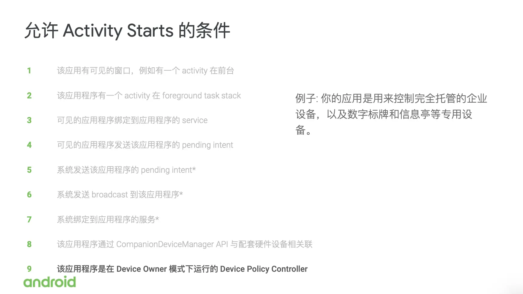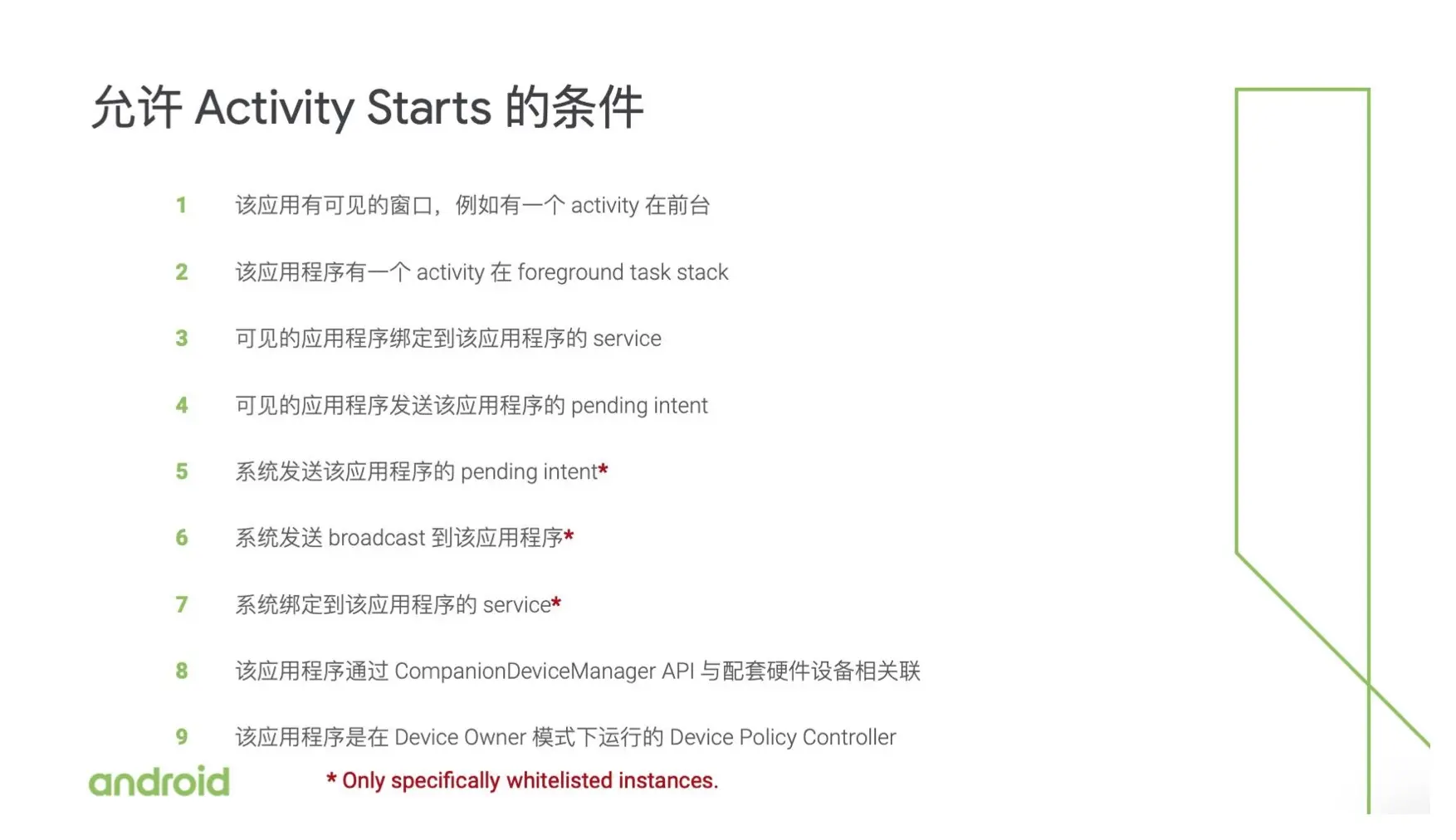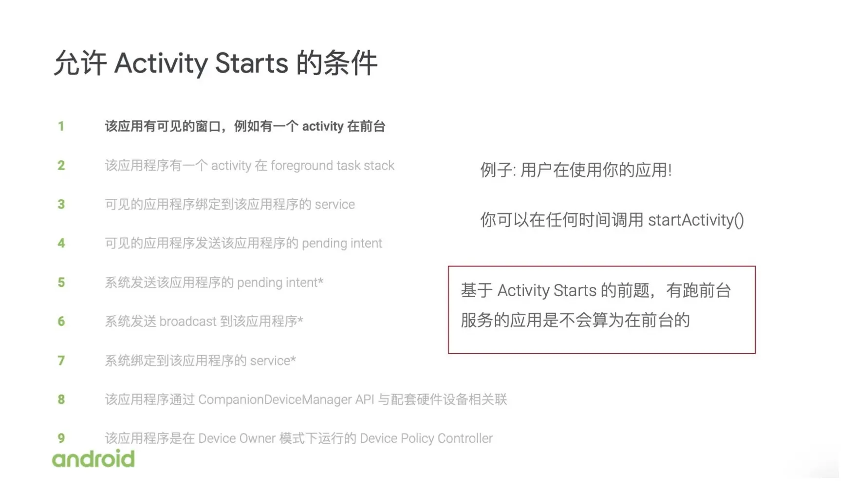 所以我们在 Android Q 版本中加了一个新的限制:应用只有在有可见的窗口,或是响应用户操作的时候才可以启动 Activity。