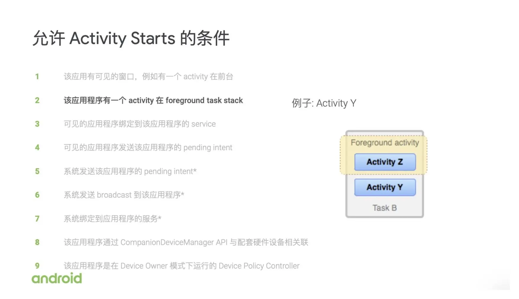 举个例子,上图中,activity Y 是暂时不在前台的,在 foreground activity starts 的上面,但这时 activity Y 其实也是可以启动新的 activity 的。