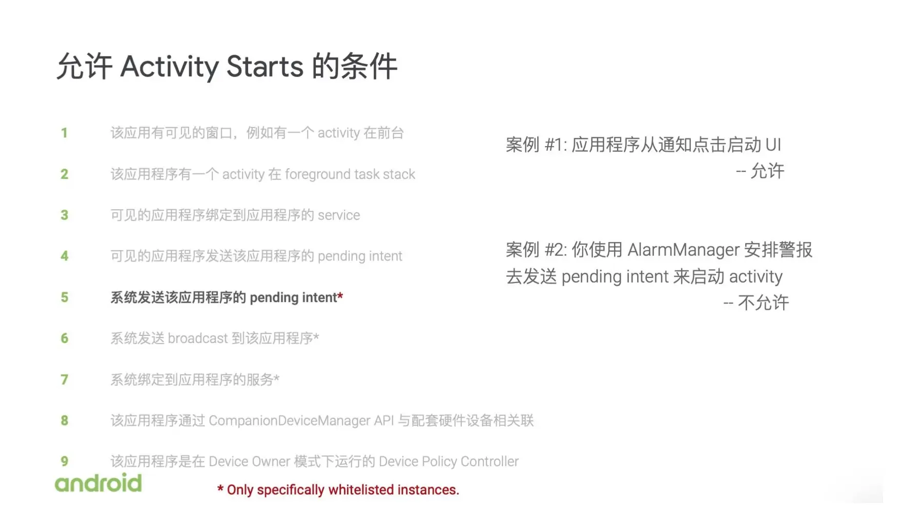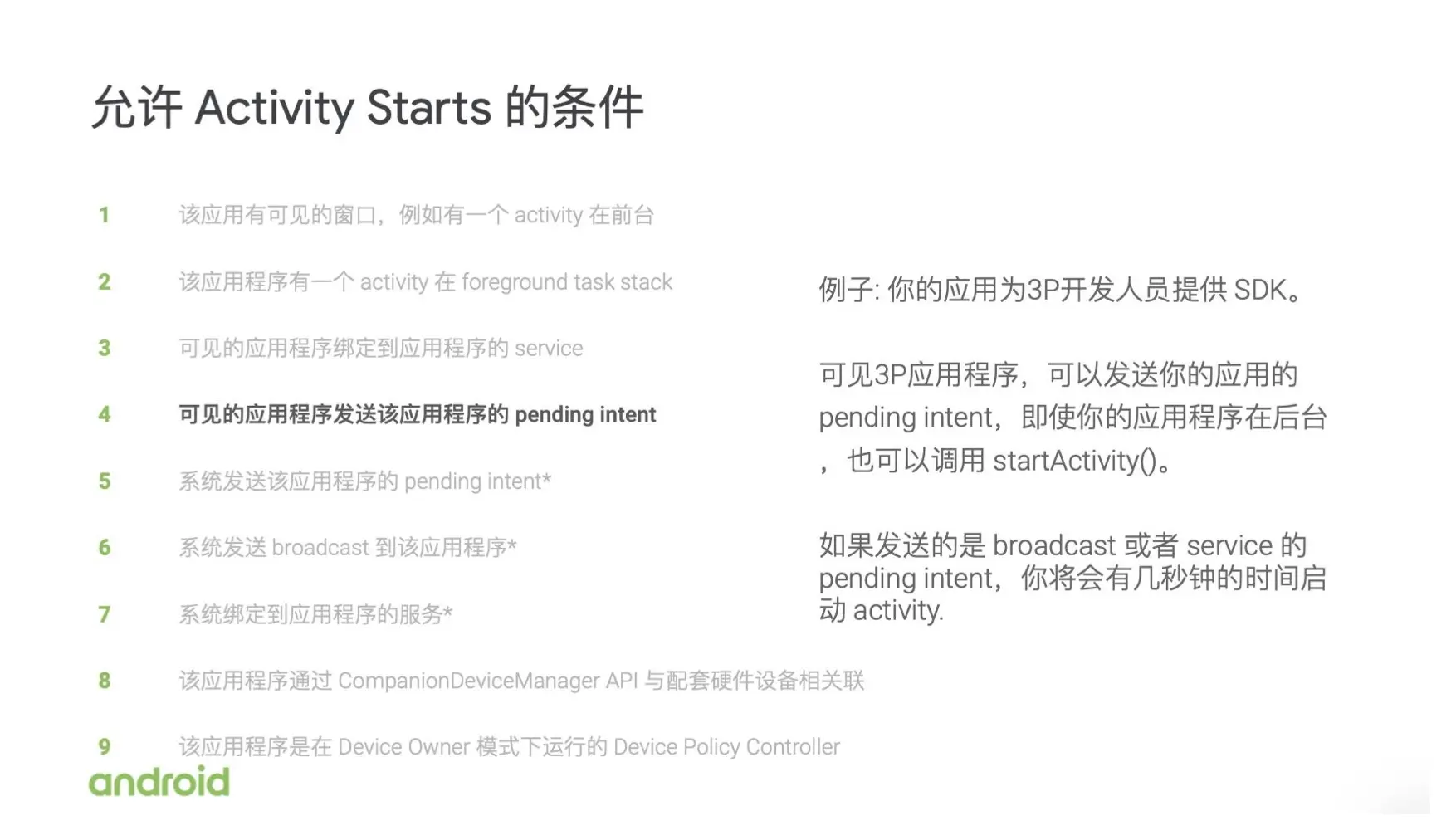 例如你的应用为第三方开发者提供 SDK,一个可见的应用发送一个 pending intent 到你的 SDK 上,这样的情况也是可以启动 activity 的。