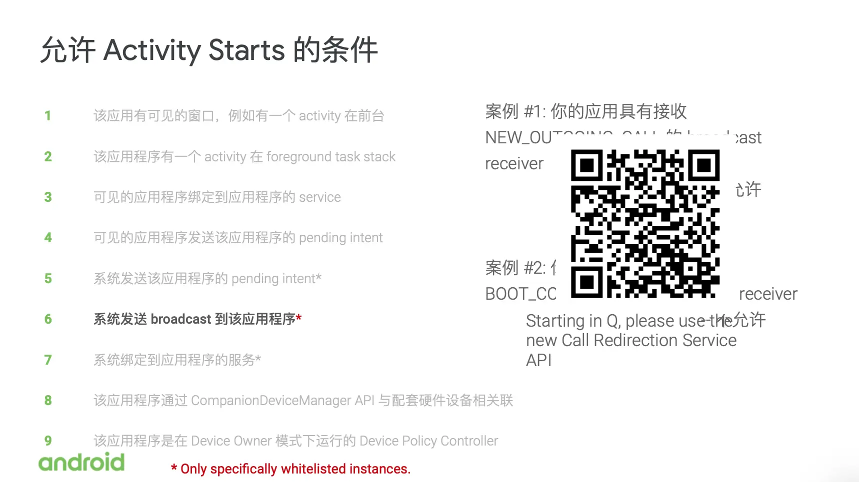 我们在 Android Q 版本中加了一个相对较新的 API,叫作 call redirection service,如果你的应用是用来接受 incoming call 或者是要处理一些打电话进来的情况,我们会建议在 Q 版本开始调用新的 APIs 。