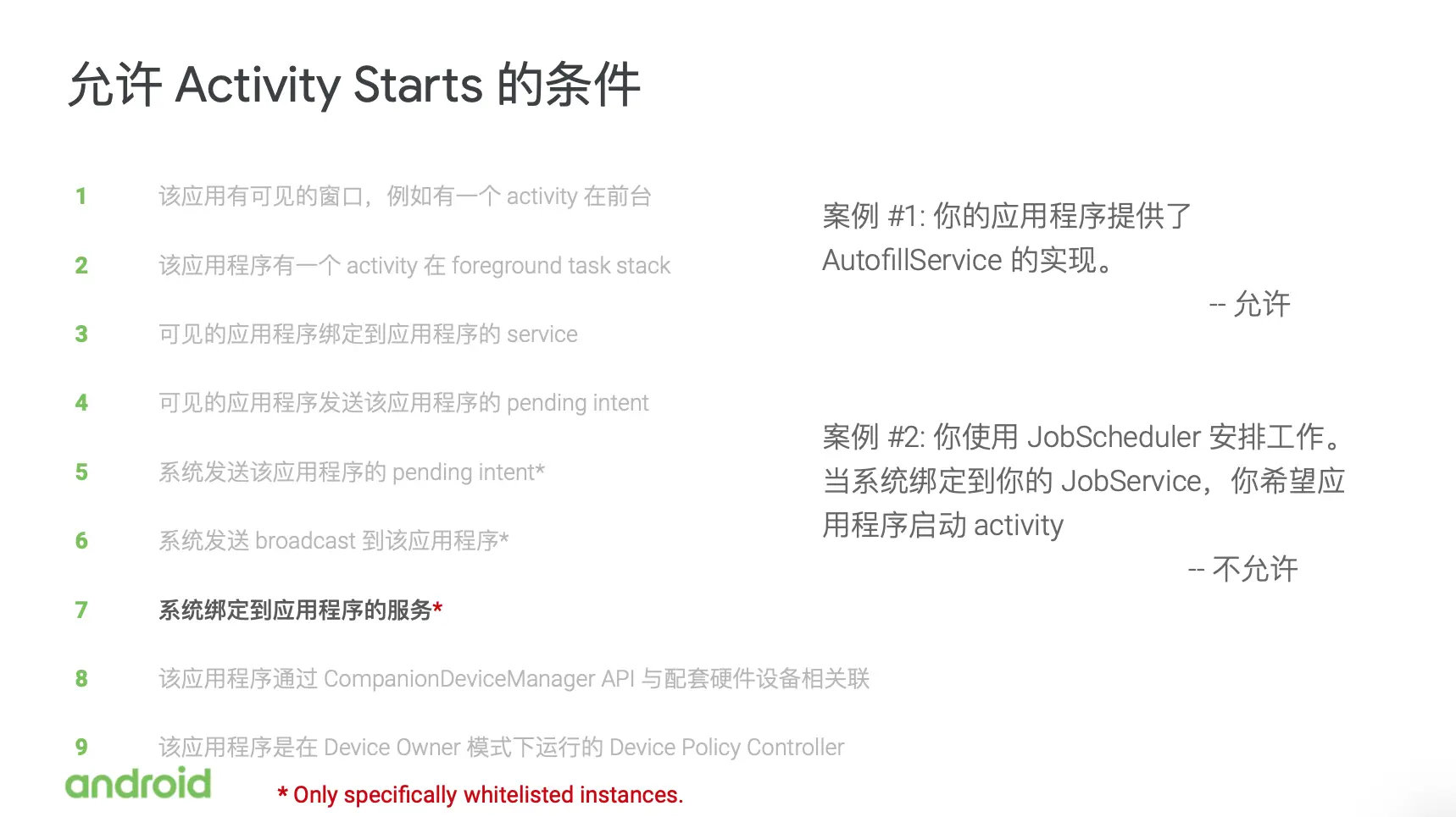 比如说你的应用是为一个可见的第三方开发者提供 SDK ,而这个 SDK 绑定到你的应用的 service 上面,这时你的应用在后台其实也是可以启动 activity 的。