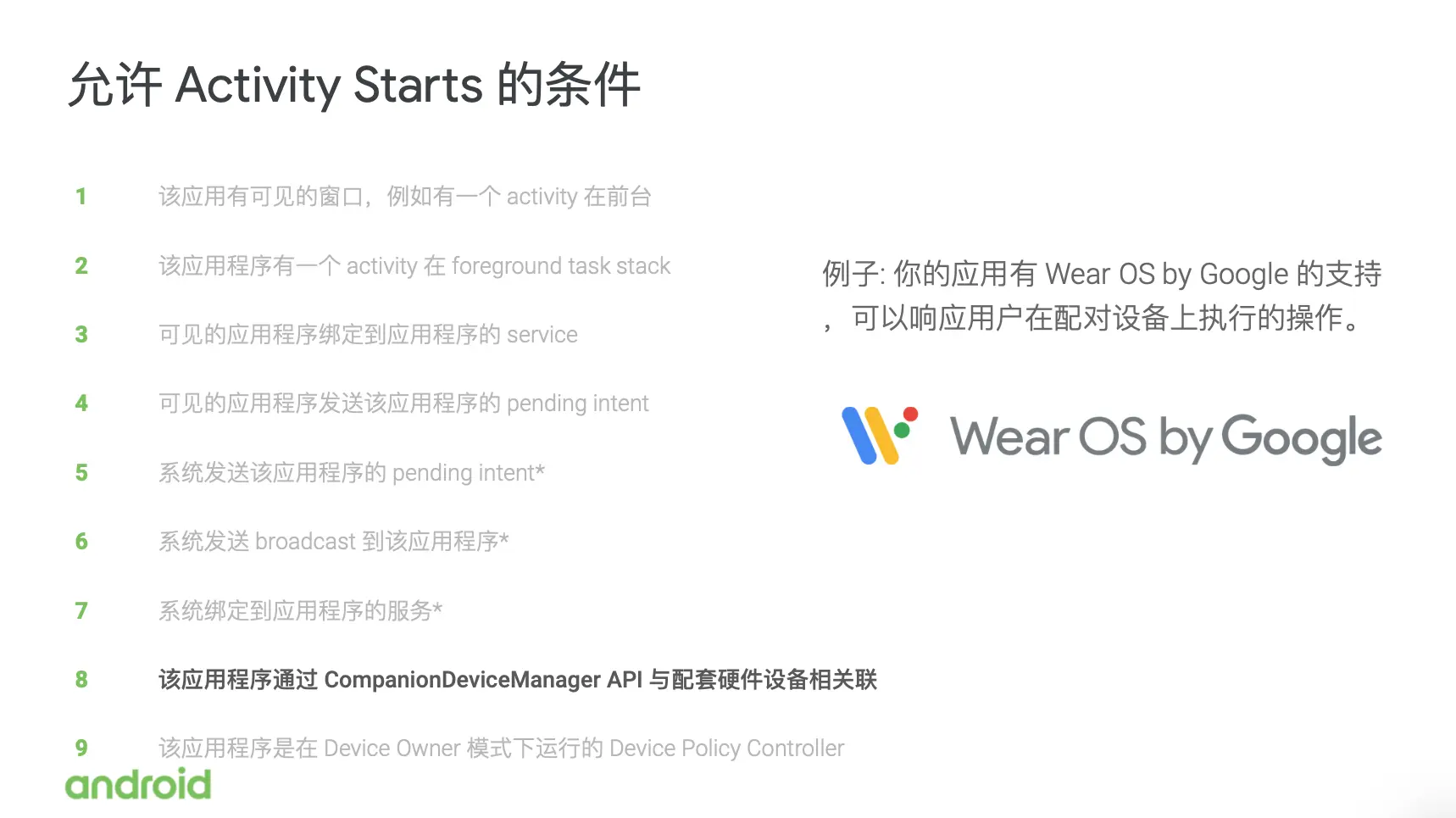例如,如果你的应用有 Wear OS by Google的支持,可以响应用户在配对设备上执行的操作。比如说,user在他的手表上做一些动作,companion APP 要弹出一个UI,在那样的场景中是允许启动activity的。