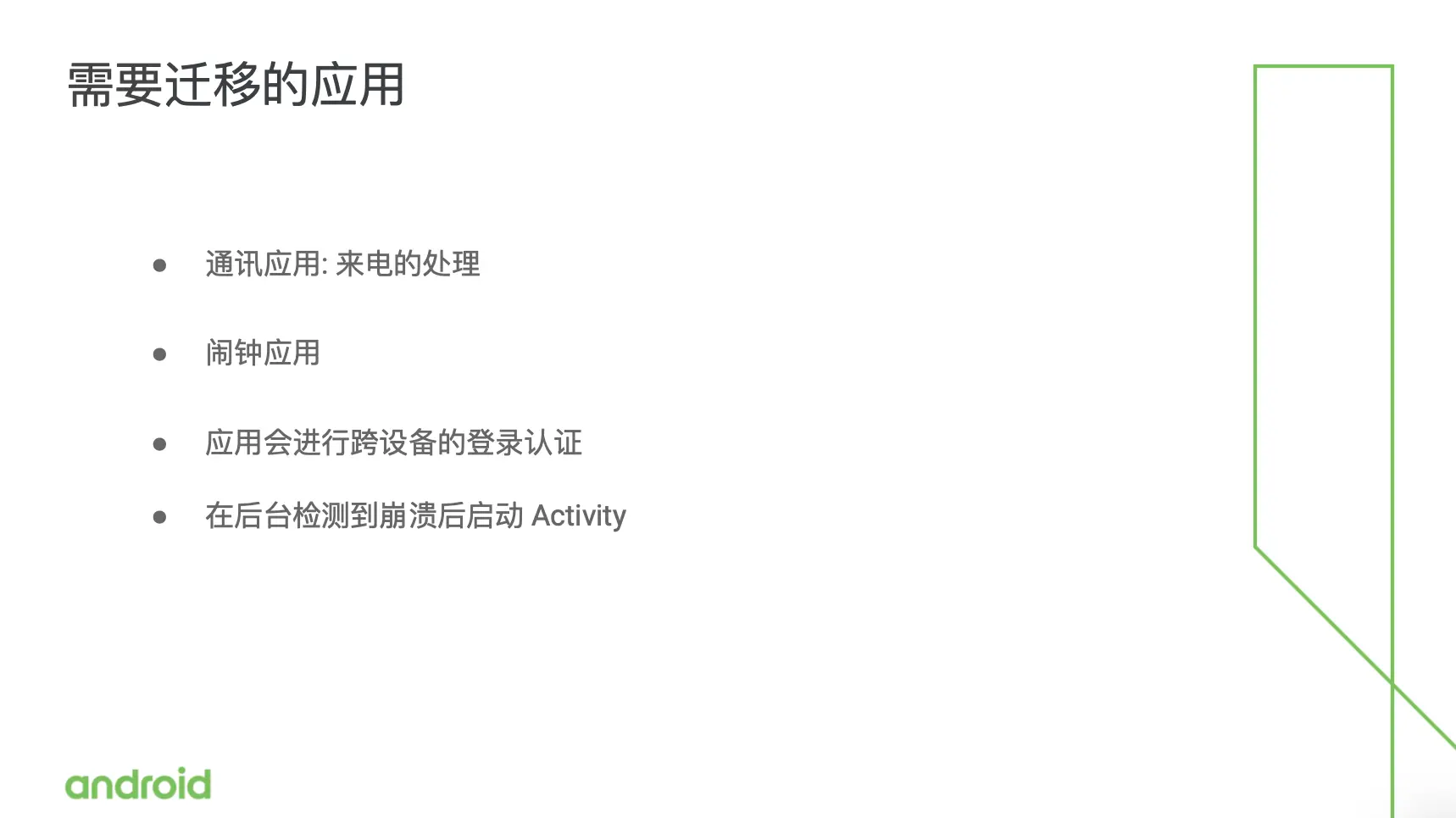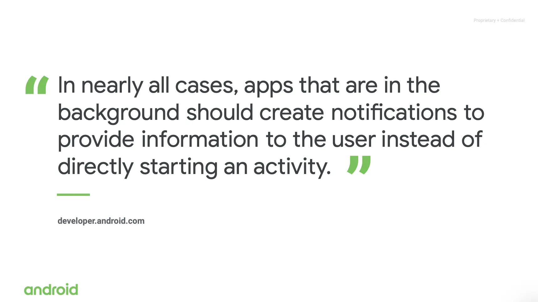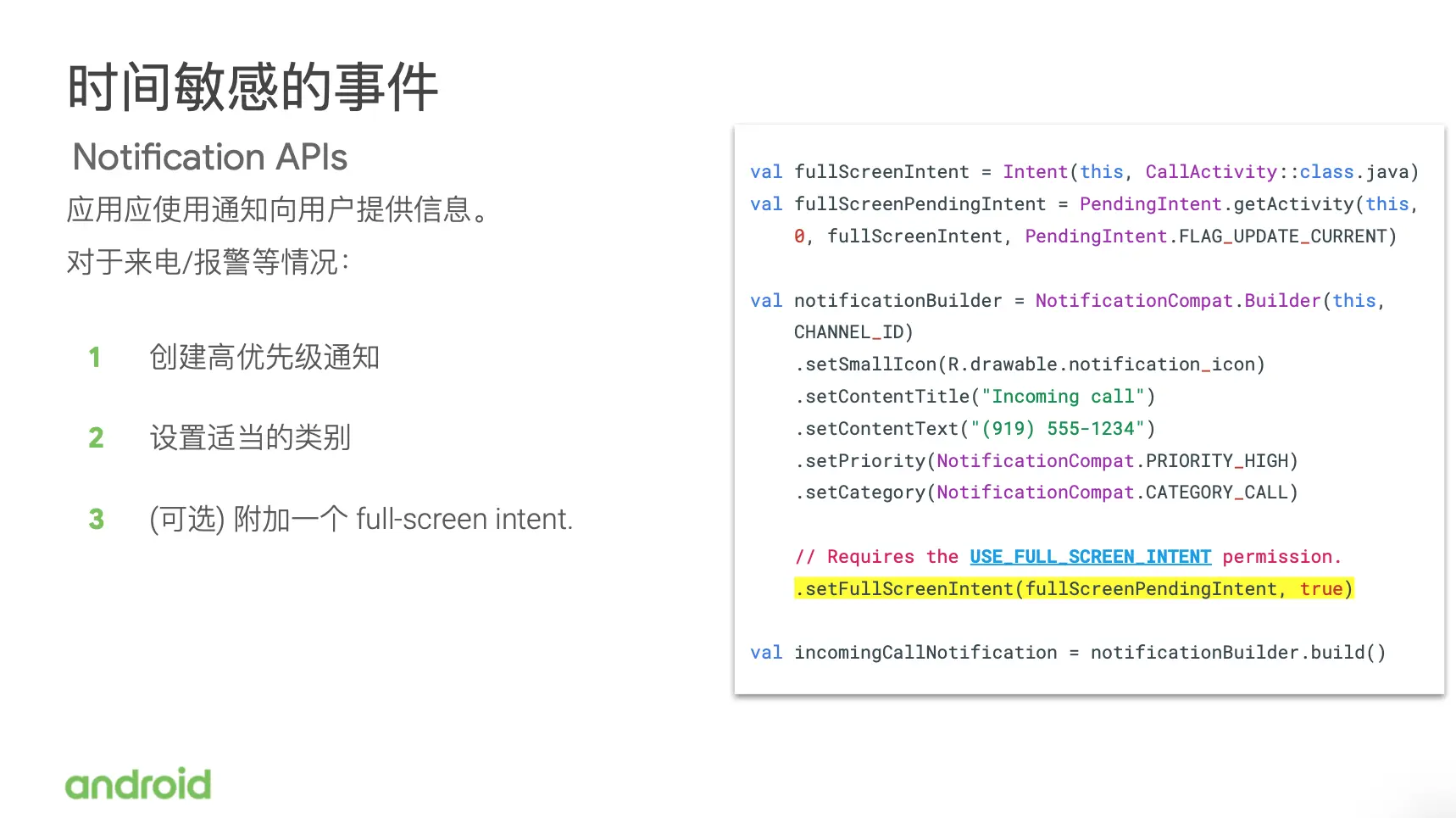 在大部分的场景,应用都可以通过 notification 来提供用户一些信息,让用户去决定要不要启动 UI。 比如说一些时间敏感的事件,你可以通过 notification APIs,创建一个高优先级的通知,给通知设置适当的类别。一个很重要的点是:在 notification 的时候,如果你希望它可以作为一个 fullscreen 的 UI 的话,我会建议加一个 setFullScreenIntent 在里面。