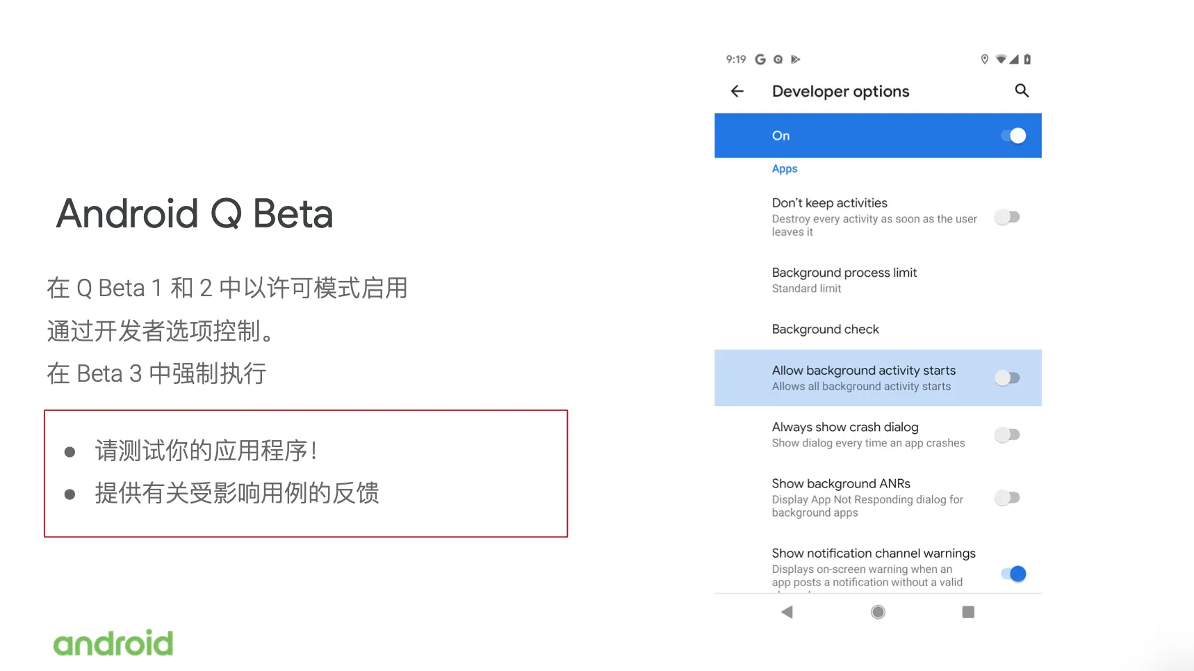 测试方面,在 Q Beta1 时我们使用一个叫许可的模式,所以在 Beta1 和 Beta2 时你能看到 toast,但 Beta3 之后再不会看到它,但我们仍有一个 setting 可以让你暂时的去 disabled 它,叫做 allow background activity starts。如果你开了这个功能,你的应用可以暂时从后台启动这个 activity,但我们只建议在适配时使用。