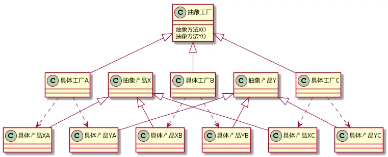 抽象工厂模式和工厂方法模式很接近,主要用于创建一组相关的对象,也就是经常会在一起被创建的对象,其类图如下: