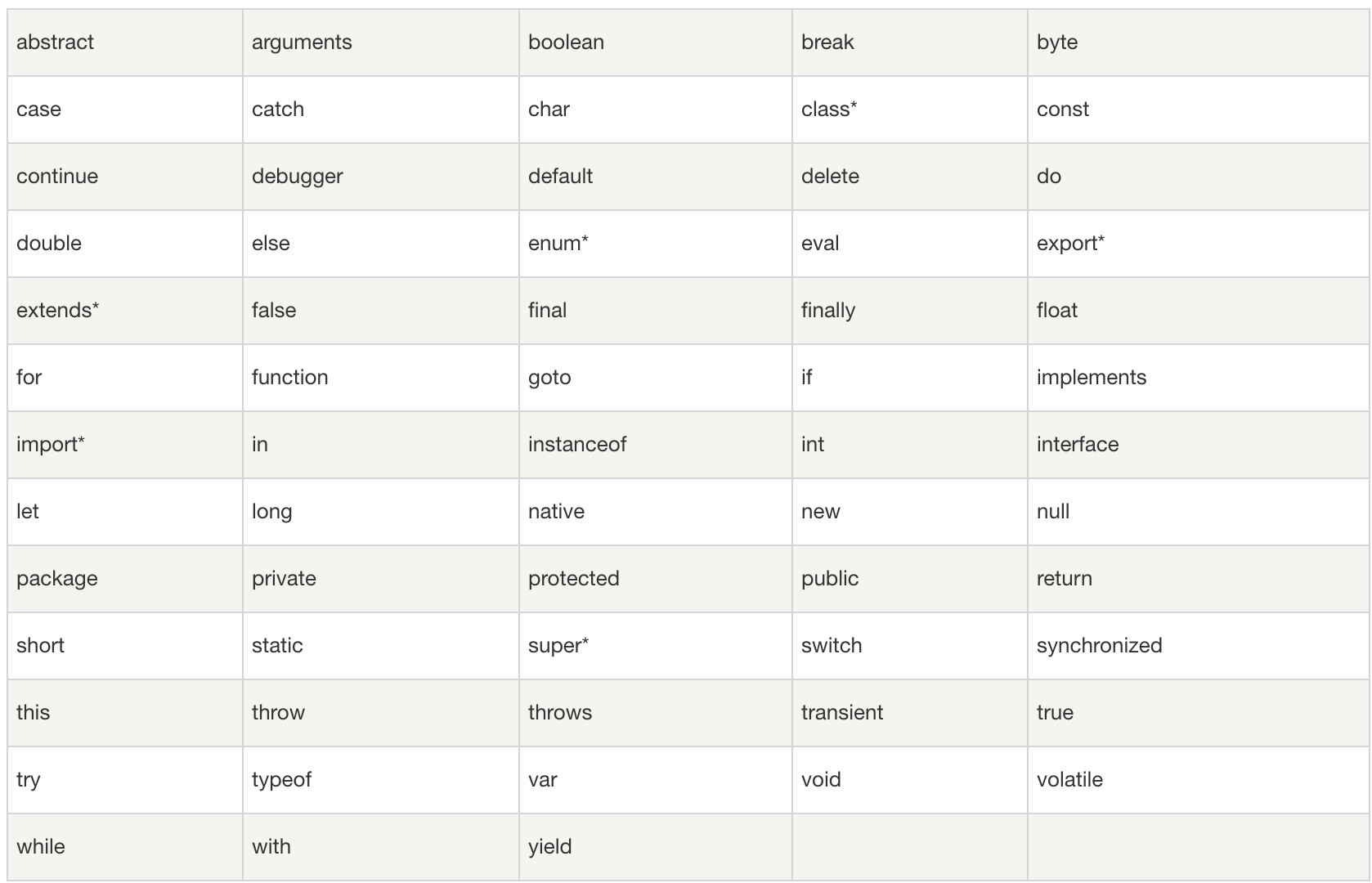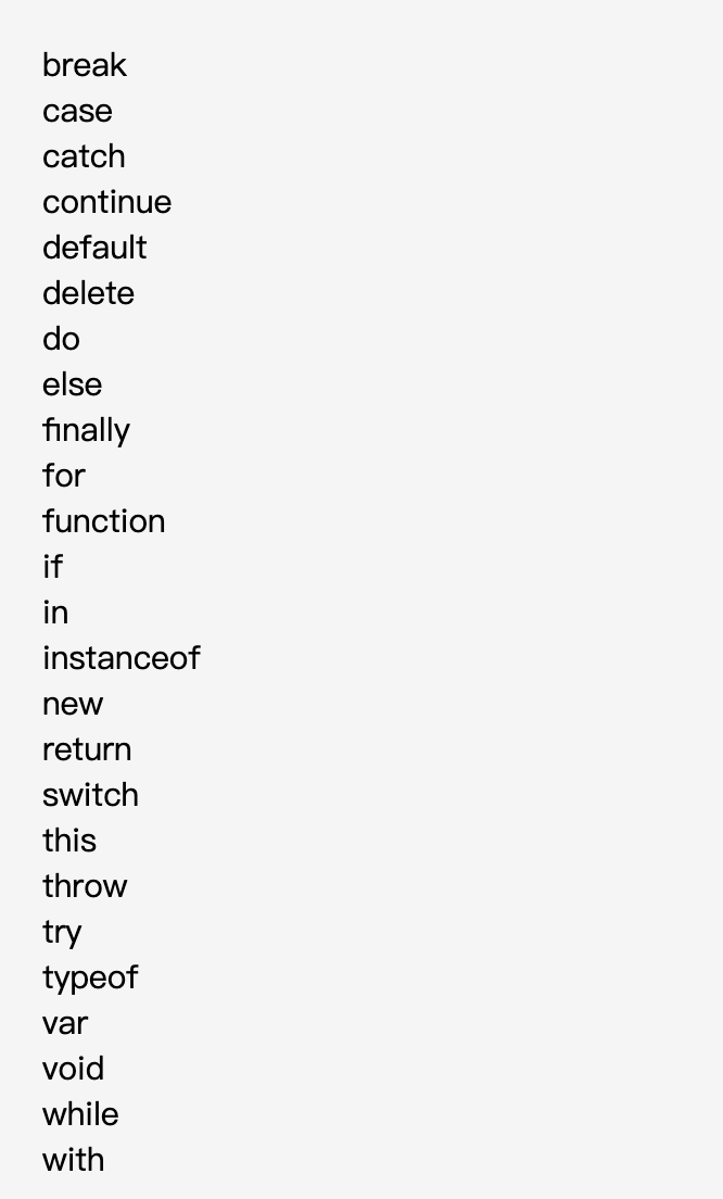 另外,ECMAScript还有一组保留字,保留字是这门语言中还没有特定作用,但将来有可能被用作关键字的一组特殊存在。同样,他们也不能被当作标识符。ECMAScript保留字的完整列表如下(* 标记的关键字是 ECMAScript5 中新添加的):