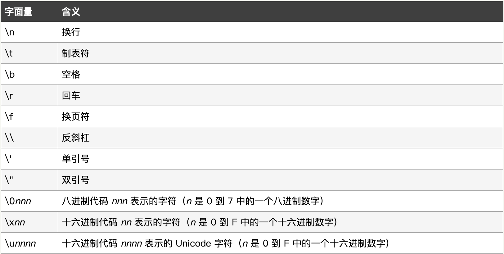 String类型包含下面一些特殊的字符字面量,也叫转义序列,用于表示非打印字符或者具有其他用途的字符,如下表(来自W3CSchool):