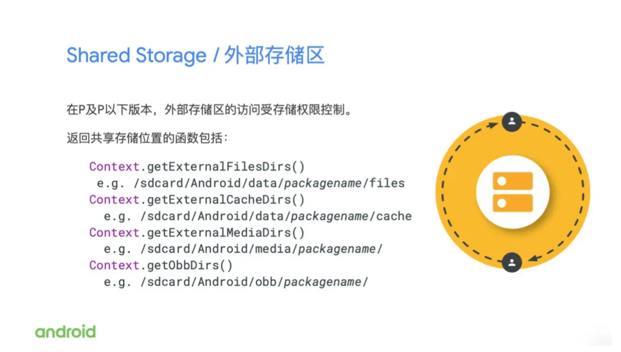 另一方面我们还有一块共享的外部存储区,也就是 shared storage。存储在这个区域里的内容,其他的应用可以通过申请权限去访问,用户也可以去直接访问。访问的方法就是将手机通过 USB 数据线连接到电脑,用户就可以在电脑端直接去看到这一块存储的内容。
