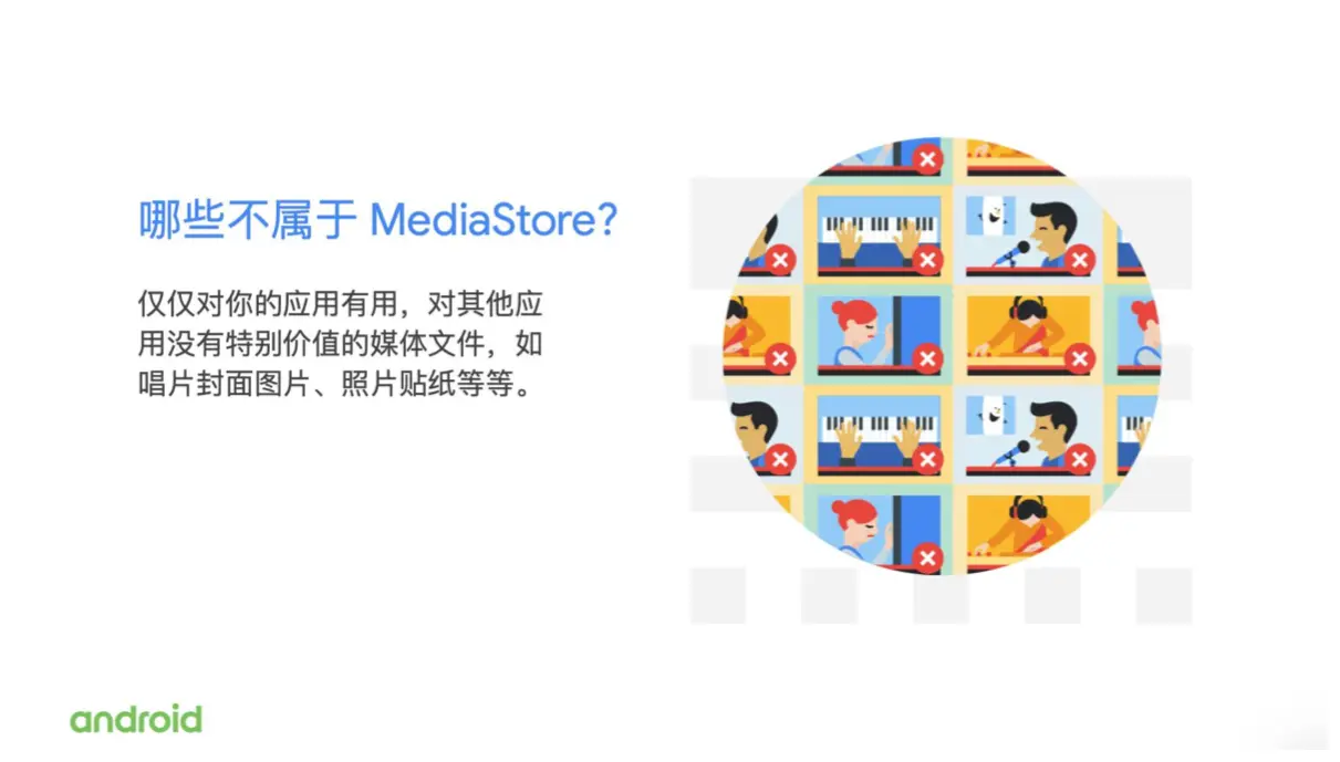 我们举一些例子来说:比如说你的应用里面会有一些缩略图文件,或者是如果你的应用是一个音乐播放类软件,他很可能会有一些专辑的封面图片这样的文件,或者是你的应用是一个美图类的应用,可能会有一些贴纸这样的资源文件。那么这样这些类型的文件就不适合被放到 Mediastore 里面。因为通常来说,用户是不会需要在其他的应用里去访问这些资源文件的,也同样是不希望应用被卸载之后,这些资源文件还残留在用户的内存区域中。